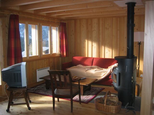 - Living style valaisan : parois ” bedrons ” mélèze, (poêle à bois, TV, canapé lit ” Ligne Roset “)